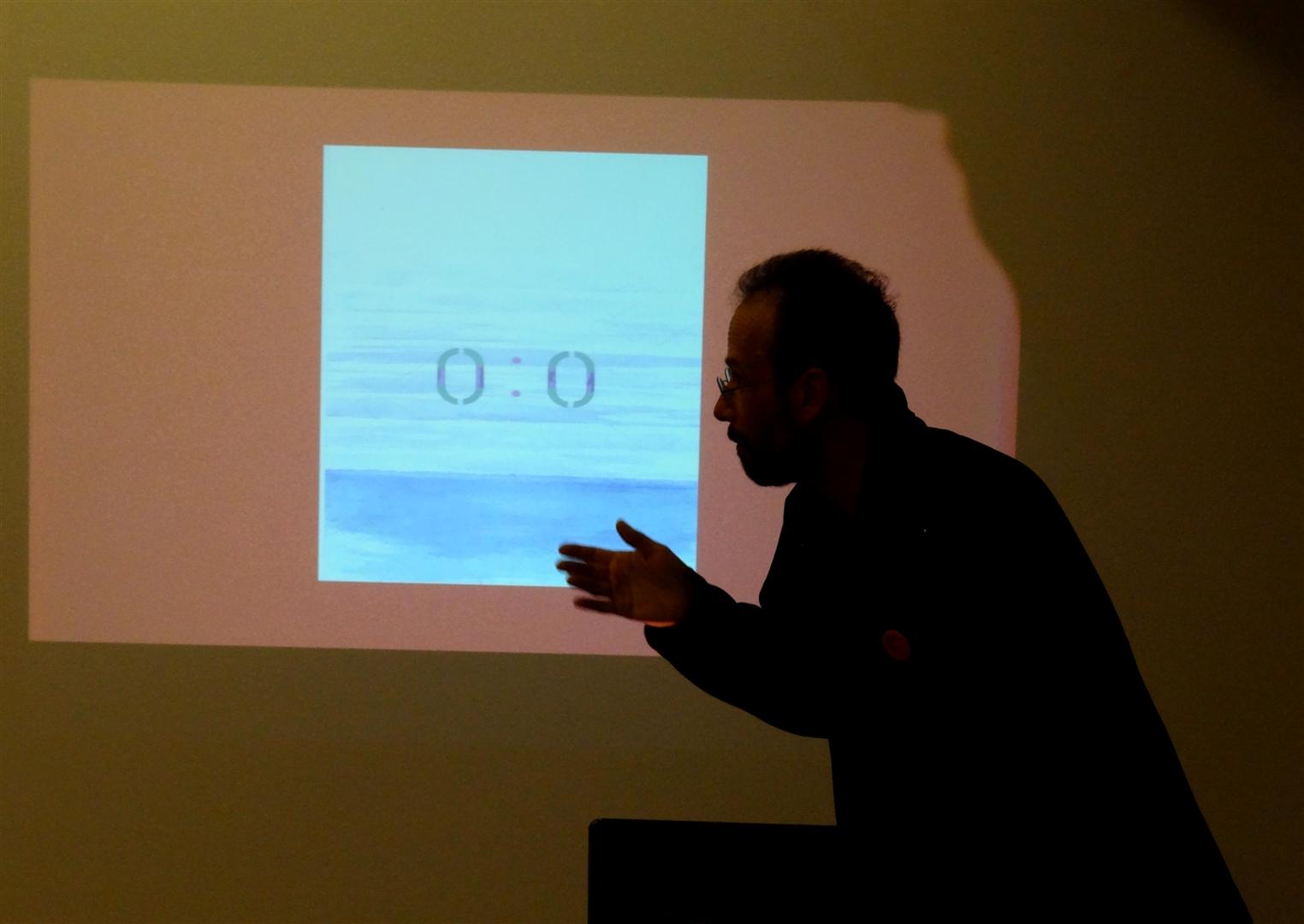 – Carlos Augusto Ribeiro, que nos propôs uma visita guiada a outros modos de ver (sentir? aperceber?) as palavras, os símbolos que nos rodeiam e enformam, que podemos recontextualizar ou recombinar até ao infinito, também, promovendo outros enlaces, outros entendimentos, outras desvairadas conjugações, tantas quantas o engenho humano se disponha a criar, interpretando.