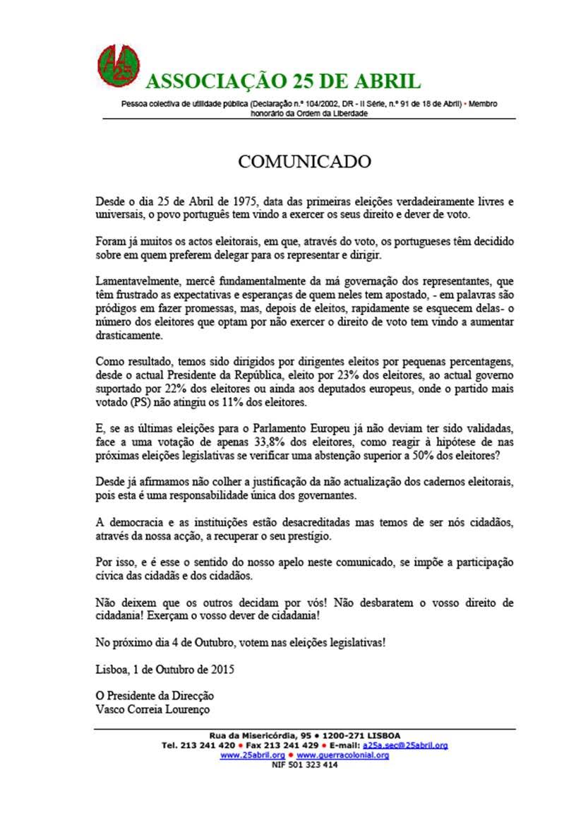 Rogerio G. V. Pereira on 3 Outubro, 2015 at 21:11 Apelar ao votoé serviço cívico podia seguir-te o exemplo, mas prefiro uma outra tua imagem. Vou "roubá-la" (daqui a nada) Reply