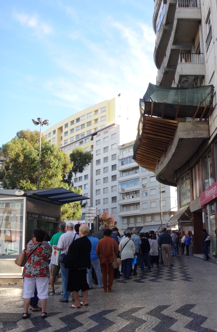 – Todos os dias, a partir das 6 ou 7 horas da manhã, na praça de Entrecampos, Lisboa, qual lugar de peregrinação das almas aflitas, constitui-se uma longa fila de cidadãos, à porta dos serviços da Segurança Social… cujo edifício, aliás, tem vindo a deixar cair algumas partes de si mesmo, face à sua relativa vetustez e notória falta de manutenção.