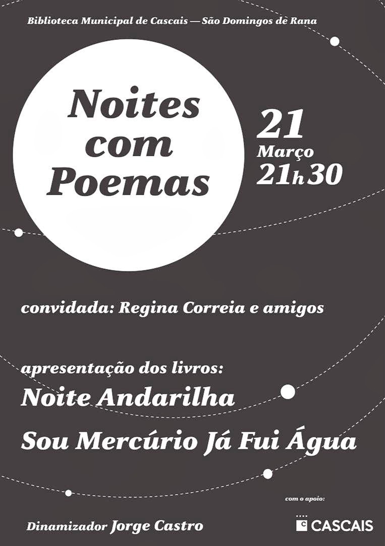 Biblioteca Municipal de Cascais – São Domingos de Rana -, teremos, como convidada, Regina Correia, que nos trará, com edição da Editora Alphabetum, o(s) livro(s) de poemas, de sua autoria, Sou Mercúrio, Já Fui Água (e Noite Andarilha – reeditado).