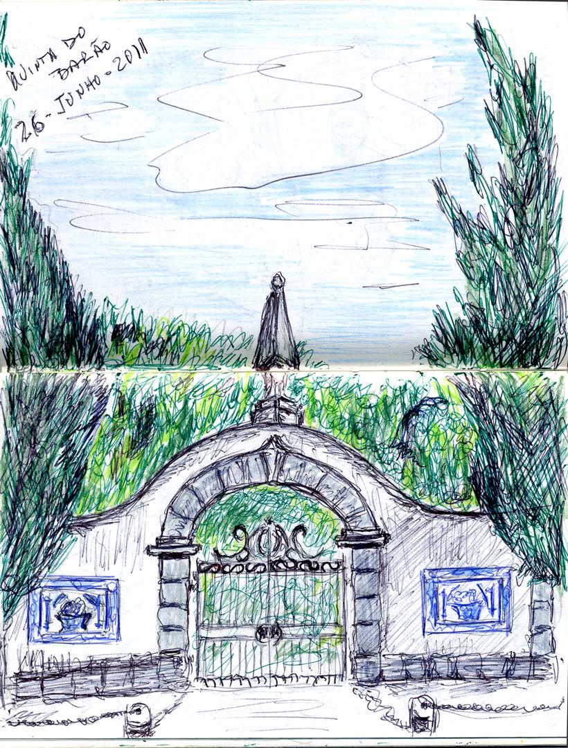 Em visita guiada à Quinta do Barão – um dos locais onde se produziu, até há bem pouco tempo, o famoso Vinho de Carcavelos, enquanto esperava a hora aprazada para o início do passeio, retive a imagem do seu portão exterior.